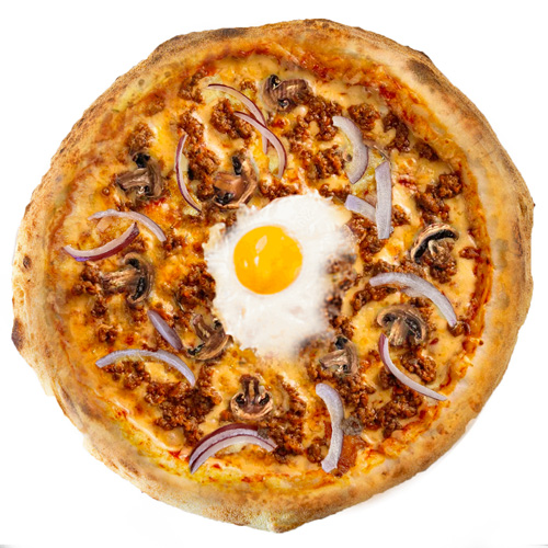 Pâtes fraîches maison, sauce tomate, mozzarella, bœuf haché, champignons, oignons rouges et œuf