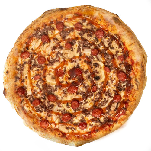 Pâtes fraîches maison, fromage, mozzarella, viande hachée marinée maison, escalope de poulet émincé marinée maison, merguez, sauce barbecue