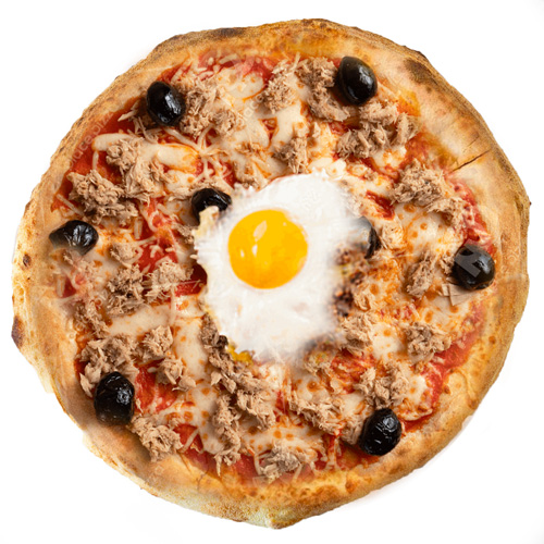 Pâte fraîche à pizza maison, sauce tomate, mozzarella, thon, œuf et olives
