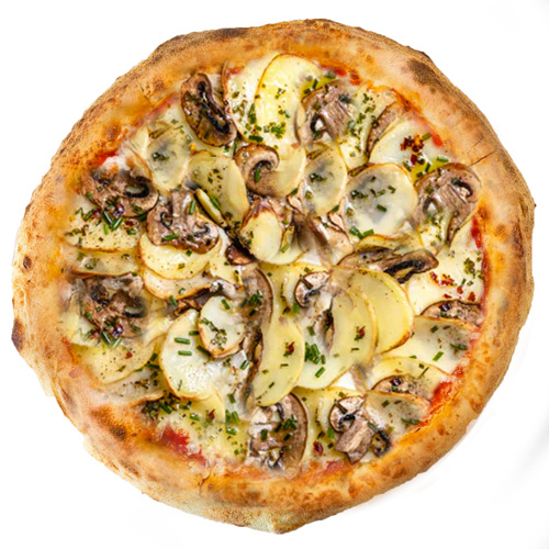 Pâte fraîche maison, sauce tomate, mozzarella, poivrons, tomates fraîches, pommes de terre et champignons